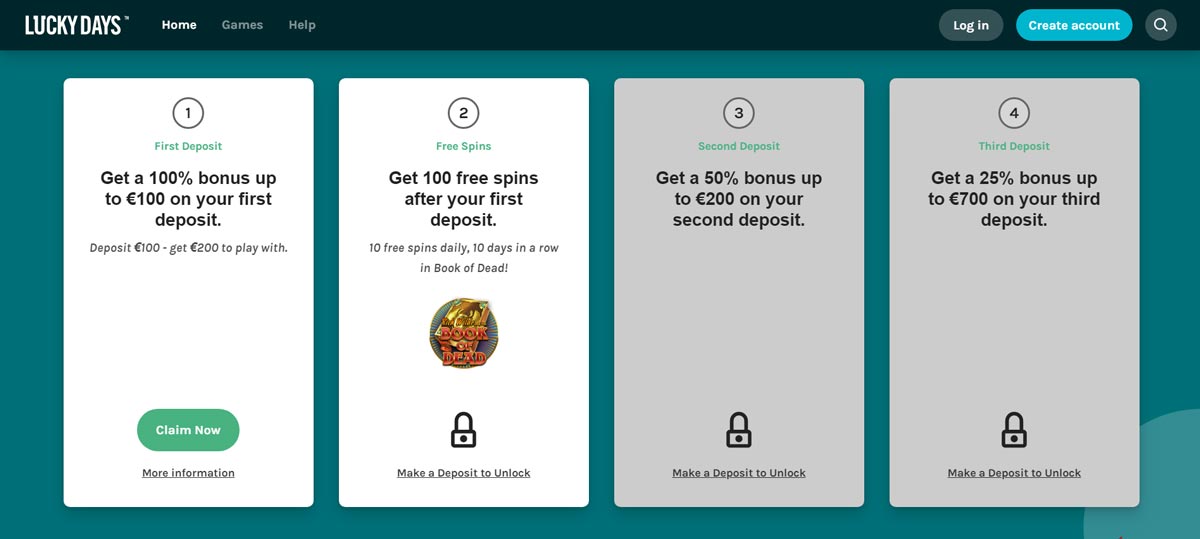 New customers at the Casino enjoy a 100% bonus up to $1,500 and 100 Lucky Days free spins on the Book of Dead upon making their first deposits. No Lucky Days Casino deposit bonus code is required to access the offer. This bonus is divided into three bonus offers each offering a 100% bonus up to $500.